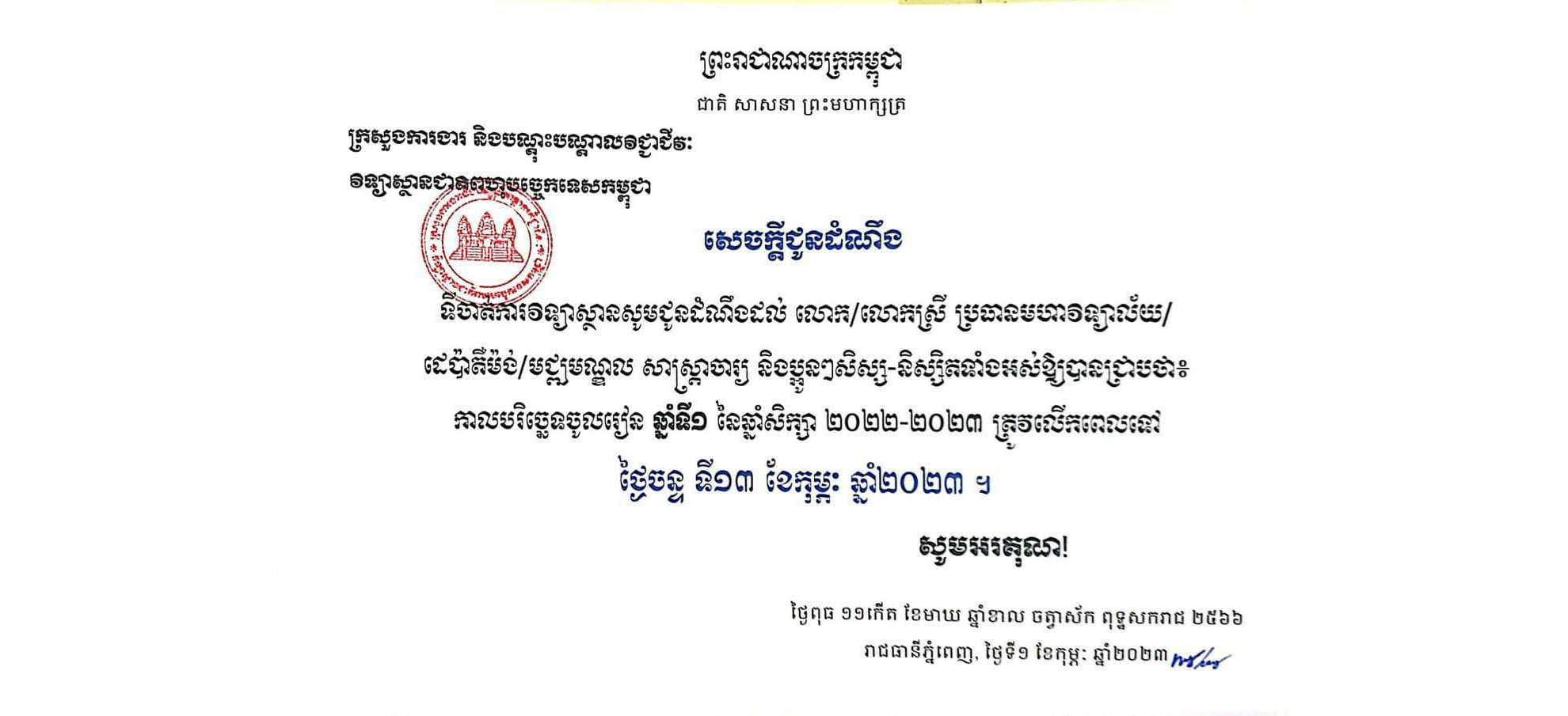 កាលបរិច្ឆេទចូលរៀនសម្រាប់និស្សិត ឆ្នាំទី១ ឆ្នាំសិក្សាសិក្សា២០២២-២០២៣ នឹងចាប់ផ្តើមពីថ្ងៃចន្ទ ទី១៣ខែកុម្ភៈ ឆ្នាំ២០២៣នេះតទៅ!