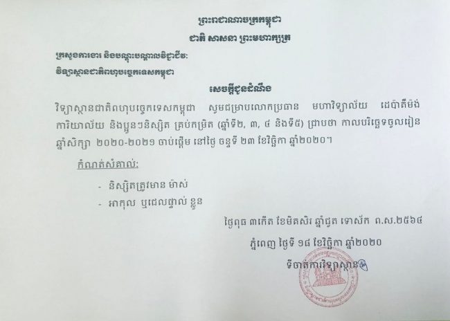 សេចក្តីជូនដំណឹង៖ បវេសនកាលឆ្នាំសិក្សាថ្មី ២០២០-២០២១ ចាប់ផ្តើមនៅថ្ងៃច័ន្ទទី២៣ ខែវិច្ឆិកា ឆ្នាំ២០២០